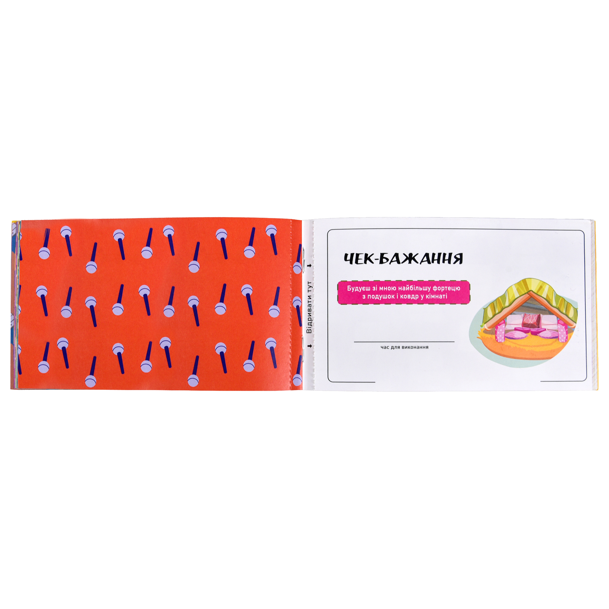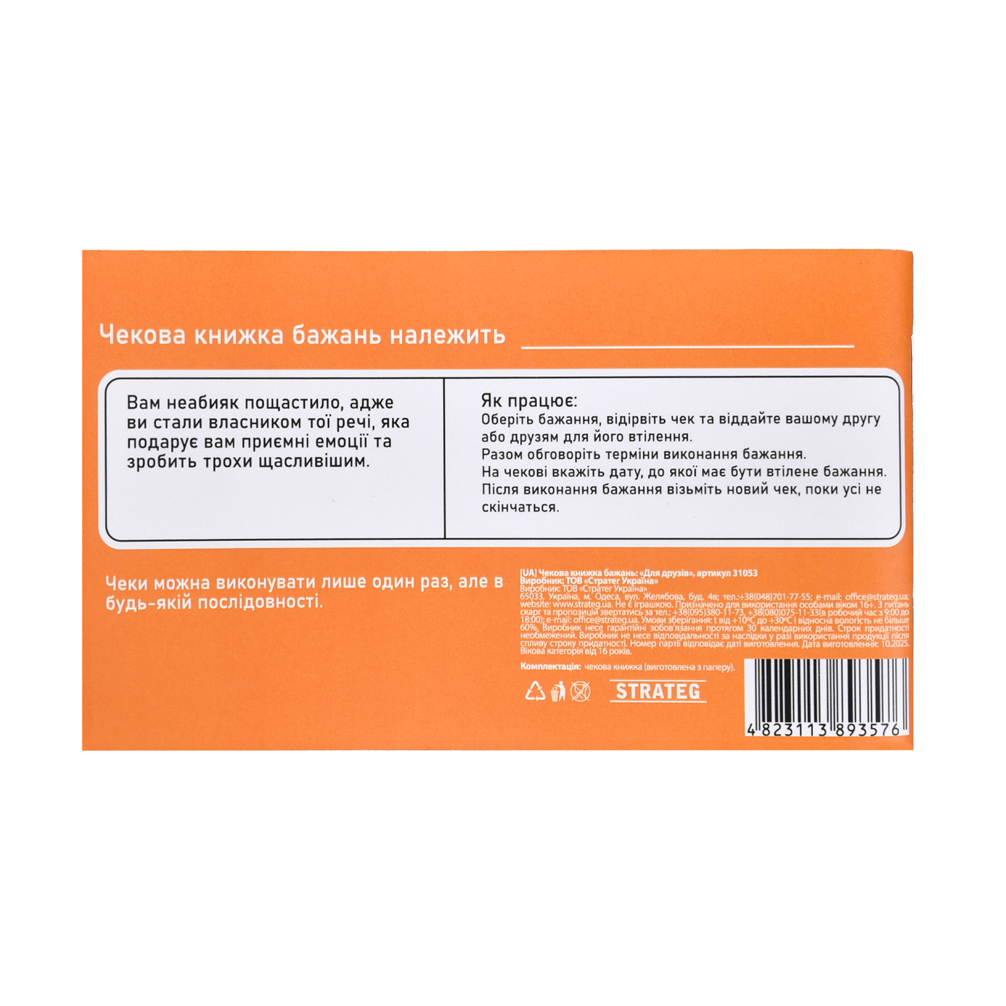 Чекова книжка бажань «Для друзів» — це оригінальний спосіб додати у спілкування більше емоцій, гумору та несподіванок. Це не просто набір завдань, а справжній генератор яскравих моментів для вашої компанії.У книжці зібрано 32 відривні чеки, кожен із яких містить цікаве побажання або веселий виклик. Достатньо вибрати чек, відірвати його, вписати дату виконання — і створити ще один теплий спогад разом. Завдання легко підлаштовуються під настрій: від жартівливих пригод до щирих дружніх жестів.Чудово підходить для подарунка, вечірок, днів народження або просто як спосіб зробити звичайну зустріч незабутньою.Вік: 16+. Комплектація: чекова книжка.