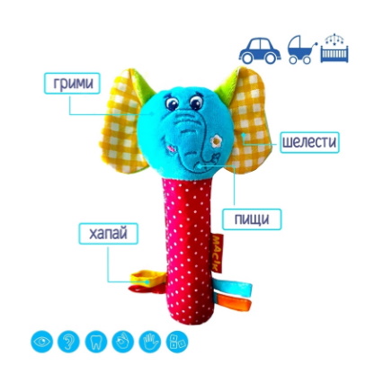 Іграшка-паличка «Зоо Слон Мілаш» — м’яке брязкальце для немовлят, яке гримить і шелестить. Містить паличку-пискавку, завитки, «смачні» вузлики та кольорові петельки для сенсорних ігор. Розвиває дрібну моторику, хапальний рефлекс і увагу малюка. Легка, приємна на дотик, пошита з різнофактурних матеріалів, безпечна і комфортна для дитини.Склад: бавовна, різнофактурні матеріали, холлофайбер, звукові елементи.Розмір: 23*11*4см