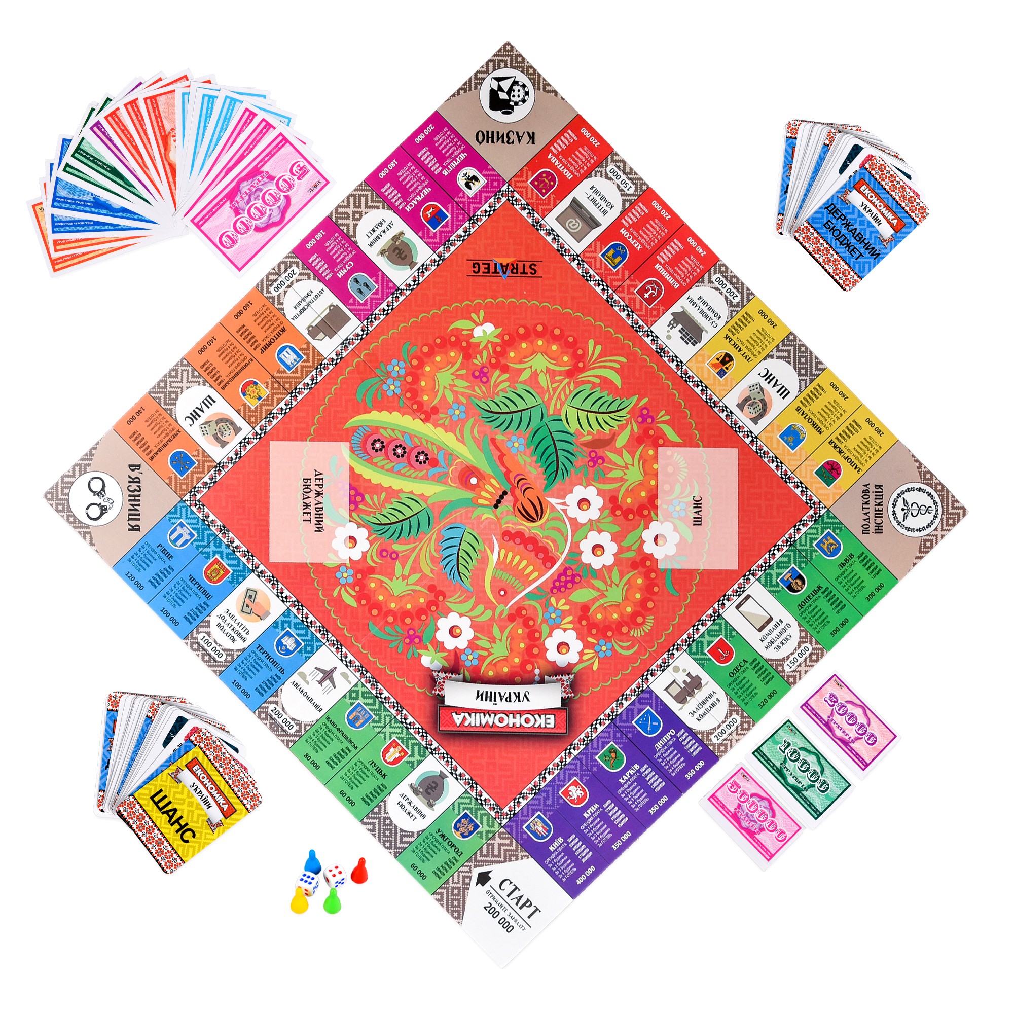 Настільна гра «Економіка України» — це стратегічна фінансова гра, у якій кожен гравець отримує шанс побудувати власну економічну імперію. Тут важливі не лише гроші, а й уміння мислити наперед, домовлятися, ризикувати та приймати зважені рішення.Рухаючись ігровим полем, гравці купують міста України, інвестують у розвиток, отримують дохід і змушують суперників платити за перебування на їхніх володіннях. Картки подій можуть як підсилити позиції, так і несподівано змінити хід гри — усе, як у справжній економіці.Гра навчає фінансової грамотності, логічного мислення та стратегічного планування у захопливій ігровій формі. Переможе той, хто наприкінці гри зуміє зберегти баланс між ризиком і прибутком та накопичить найбільший капітал.Кількість гравців: 2–4.Вік: 8+.Комплектація: коробка, ігрове поле, гральні фішки — 4 шт., гральні кубики — 2 шт., картки «Право власності» — 31 шт., картки «Державний бюджет» — 20 шт., картки «Шанс» — 20 шт., комплект гральних банкнот, комплект готелів, комплект будинків, інструкція.