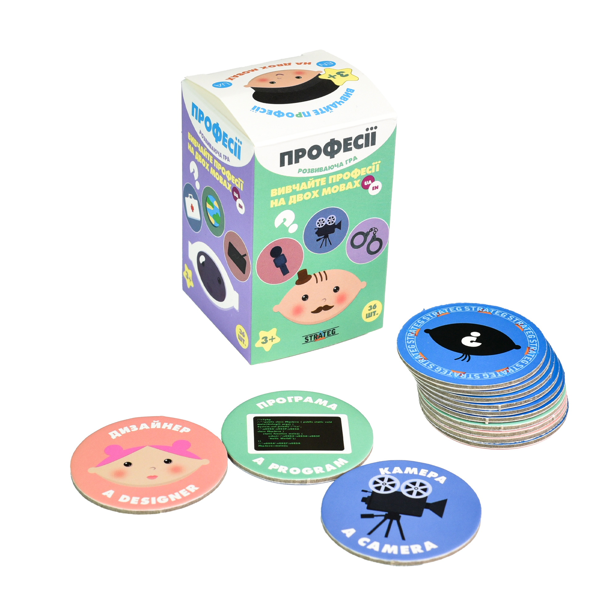 Настільна гра «Професії» — навчальна гра для дітей, що знайомить із різними професіями та їх атрибутами. У наборі 36 тайлів, на кожному з яких зображена професія та два пов’язані з нею предмети.Гра розвиває мовлення, логіку, уяву та словниковий запас українською та англійською, роблячи навчання веселим і захопливим. Підходить для домашнього використання та дитячих садків.Комплектація: коробка, 36 круглих карток, інструкція
